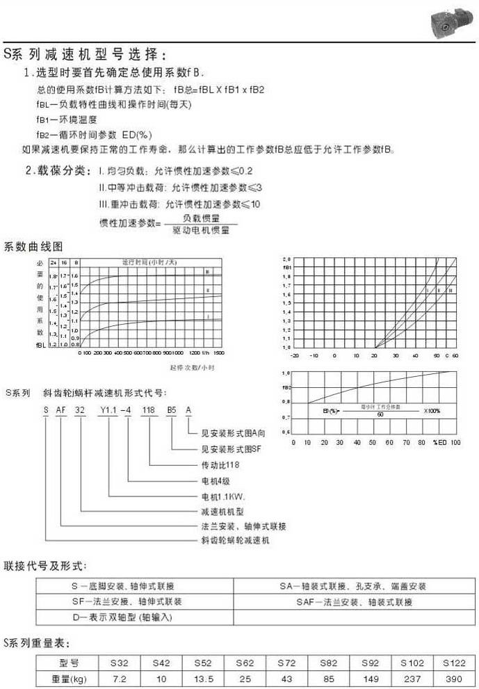 S系列減速機型號表示系數(shù)曲線圖聯(lián)結(jié)代號及形式重量表